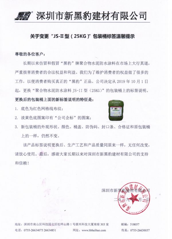| 尊敬的各位客戶: 長期以來假冒和仿冒“黑豹”牌聚合物水泥防水涂料在市場上大行其道,嚴重損害消費者的合法權(quán)益和利益。我們?yōu)榱司S護消費者的權(quán)益做了很多的工作,以便消費者購買真正的“黑豹”正品。公司決定從2019年10月1日起,更換“聚合物水泥防水涂料JS-II型(25KG)”的包裝桶上的標簽說明。 更換后的包裝桶上面的新標簽說明的特征是: 1.底色為紅色網(wǎng)格線布紋; 2.淡黃色底圖案印有“公司企標”的圖案; 3.新包裝桶的外觀形狀、顏色、桶蓋、防偽碼、封口條、合格證和原包裝桶上的一樣,仍然不變。 該產(chǎn)品標簽說明更換后、生產(chǎn)工藝和產(chǎn)品質(zhì)量同原來一樣,無任何改變。請放心使用。最后,感謝大家長期以來對深圳市新黑豹建材有限公司的支持和信賴!