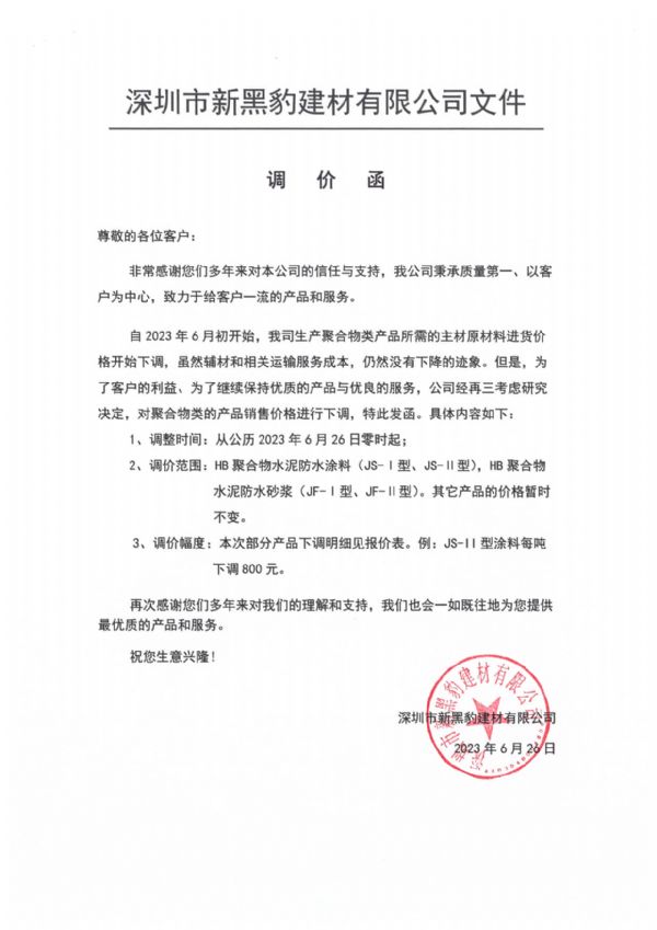 尊敬的各位客戶: 非常感謝您們多年來對(duì)本公司的信任與支持,我公司秉承質(zhì)量第一、以客戶為中心,致力于給客戶一流的產(chǎn)品和服務(wù)。 自2023年6月初開始,我司生產(chǎn)聚合物類產(chǎn)品所需的主材原材料進(jìn)貨價(jià)格開始下調(diào),雖然輔材和相關(guān)運(yùn)輸服務(wù)成本,仍然沒有下降的跡象。但是,為了客戶的利益、為了繼續(xù)保持優(yōu)質(zhì)的產(chǎn)品與優(yōu)良的服務(wù),公司經(jīng)再三考慮研究決定,對(duì)聚合物類的產(chǎn)品銷售價(jià)格進(jìn)行下調(diào),特此發(fā)函。具體內(nèi)容如下: 1、調(diào)整時(shí)間:從公歷2023年6月26日零時(shí)起; 2、調(diào)價(jià)范圍:HB聚合物水泥防水涂料(JS-Ⅰ型、JS-Ⅱ型),HB聚合物水泥防水砂漿(JF-Ⅰ型、JF-Ⅱ型)。其它產(chǎn)品的價(jià)格暫時(shí)不變。 3、調(diào)價(jià)幅度:本次部分產(chǎn)品下調(diào)明細(xì)見報(bào)價(jià)表。例:JS-II型涂料每噸下調(diào)800元。 再次感謝您們多年來對(duì)我們的理解和支持,我們也會(huì)一如既往地為您提供最優(yōu)質(zhì)的產(chǎn)品和服務(wù)。 祝您生意興隆! 深圳市新黑豹建材有限公司 2023年6月25日