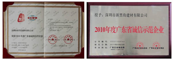 ★ 熱烈祝賀深圳市新黑豹建材有限公司榮獲“2010年度廣東省誠信示范單位”稱號